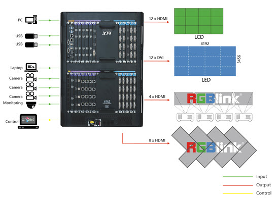 Za celokupne sisteme video ekrana, X14 donosi novi nivo efikasnosti, sposobnosti i kontrole. Podržavajući masivnih 52 ulaza i do 40 izlaza, X14 spaja velike video sisteme u video prezentaciji i integraciji. Modularne RGBlink tehnologije podržavaju ulazne i izlazne signale prilagođene korisniku, a svaki slot konfigurira do 4K / UHD rezolucije pri punoj brzini snimanja.